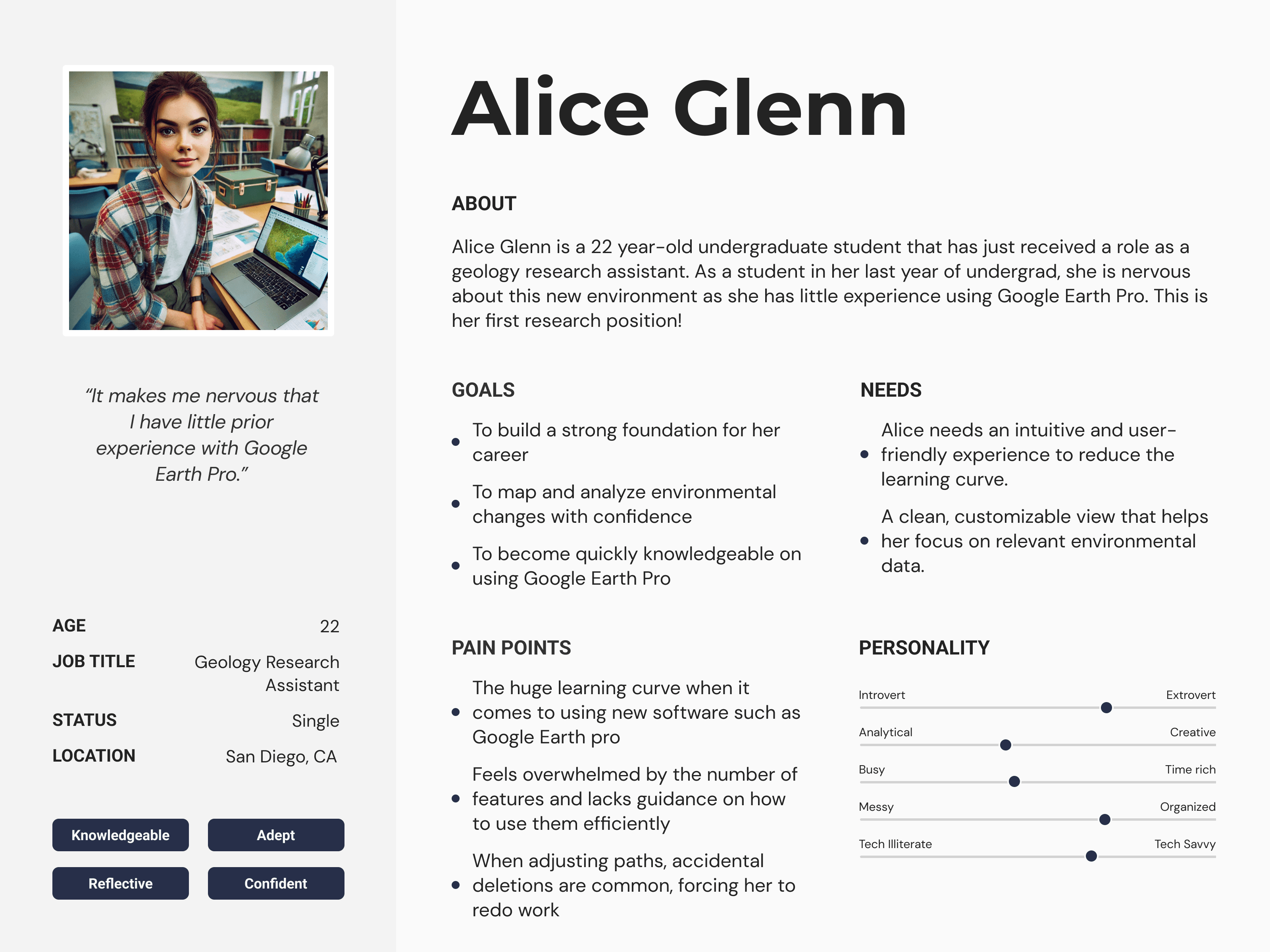 We went ahead with a geology researcher, Loren, and worked to understand what her role and daily tasks. With this initial interview, we had Loren walk us through a typical task on Google Earth Pro.