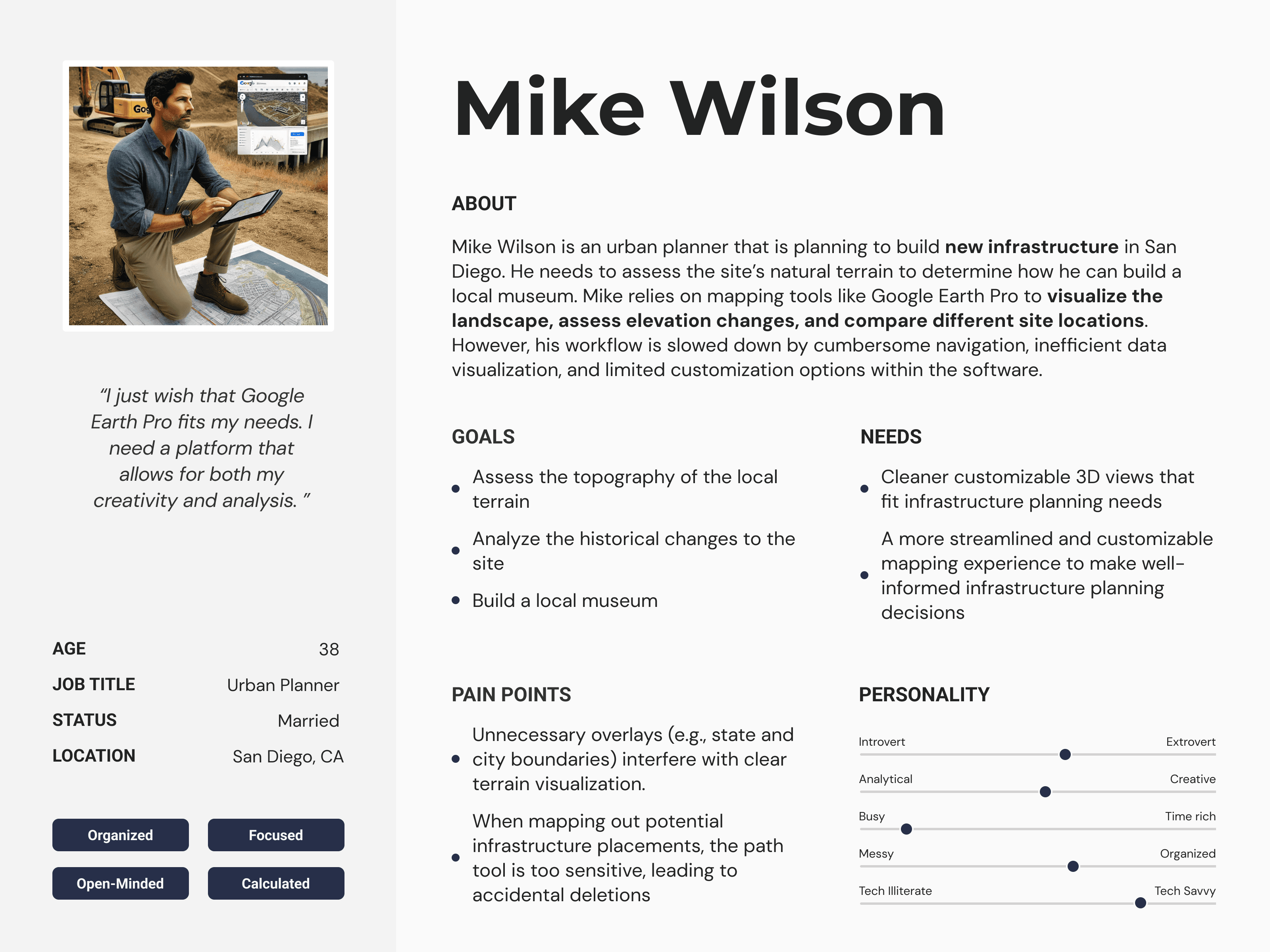 While our primary stakeholder is a geology researcher studying land changes, water access and geographic patterns, my team kept in mind that this tool is also used by any professional who works with mapping tools for environmental planning, land use, and urban development, or GIS analysts.